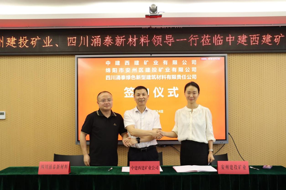 6月24日,綿陽(yáng)安州礦產(chǎn)資源集團(tuán)有限公司(以下簡(jiǎn)稱“建投礦業(yè)”)與中建西建礦業(yè)有限公司(以下簡(jiǎn)稱“中建西建礦業(yè)”)、四川涌泰綠色新型建筑材料有限責(zé)任公司(以下簡(jiǎn)稱“四川涌泰新材料”)于成都正式簽署戰(zhàn)略合作協(xié)議。建投礦業(yè)黨支部委員、總經(jīng)理?xiàng)铈面?,中建西建礦業(yè)黨總支副書記、總經(jīng)理袁雪云,四川涌泰新材料董事長(zhǎng)徐鳳瓊參加座談會(huì)及簽約儀式。